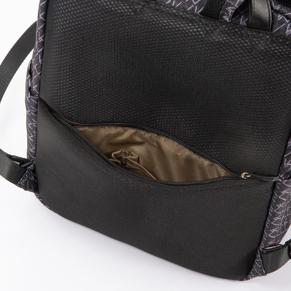 背中と接する背面にセキュリティポケットを配置しました。お財布やパスポートなど貴重品の収納に適しています。
