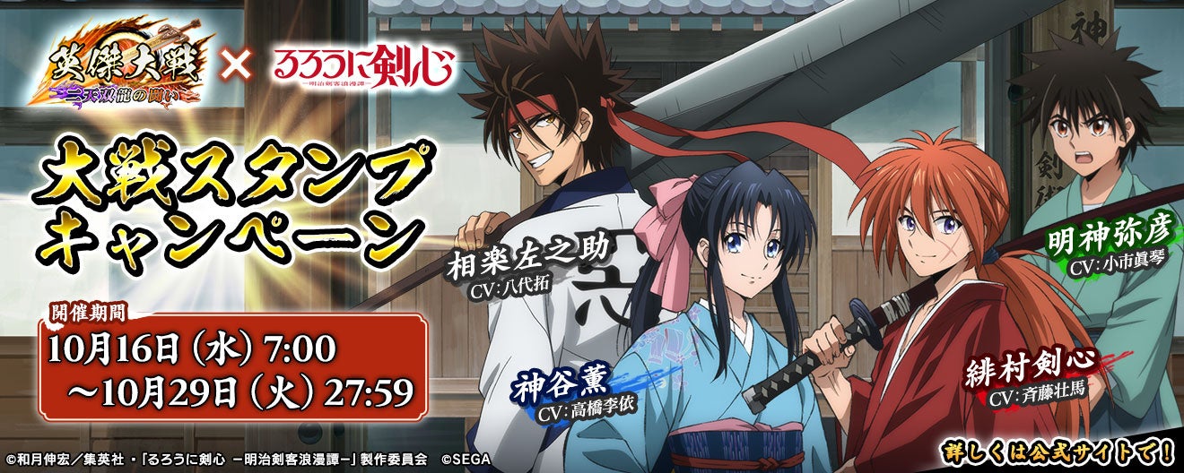 株式会社セガ フェイブ(本社:東京都品川区、代表取締役社長執行役員:杉野行雄)は、現在稼働中のアミューズメント施設向け対戦型カードアクションゲーム『英傑大戦 二天双龍の闘い』(以下、英傑大戦)において、TVアニメ「るろうに剣心 -明治剣客浪漫譚-」とのコラボイベントを、本日2024年10月16日(水)より開始したことをお知らせいたします。