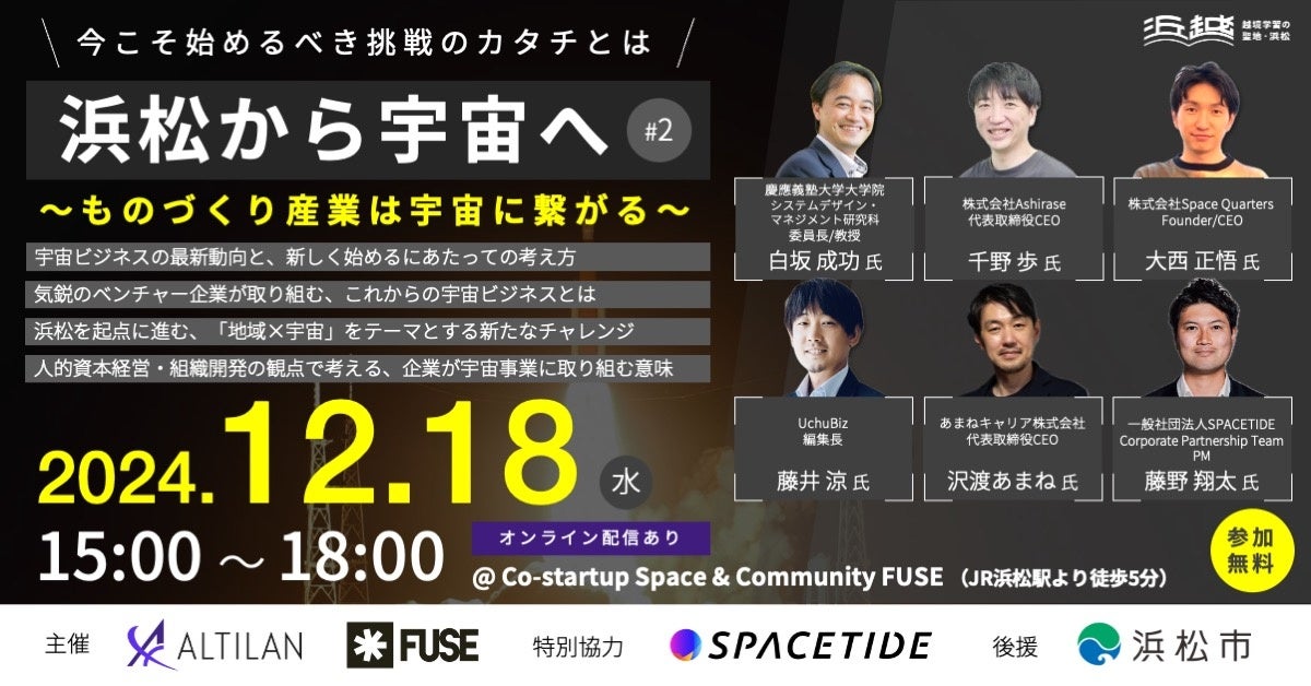 宇宙ビジネスを専門とするALTILAN、地域発の宇宙ビジネス創出・活性化を目的に「浜松から宇宙へ#2~ものづくり産業は宇宙に繋がる~」を、12月18日(水)15時から浜松市・FUSEで開催(参加無料)