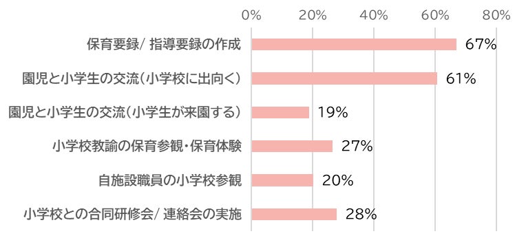 保育所と小学校の連携は約8割の施設で実施されているが、学童保育との連携は1割程度にとどまる。