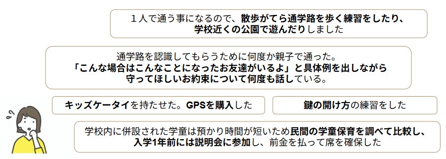 各家庭において、下校練習を繰り返し実施したり、お子様が危険を理解できるよう説明を工夫したりと、放課後を安全に過ごすための練習を行っています。また、学童保育の手配、携帯電話やGPSの購入、鍵の開閉練習といった準備も求められます。一方で、「子どもだけの留守番は不安」などと感じながらも、有効な手段・方法を準備できていない家庭もあるとみられます。