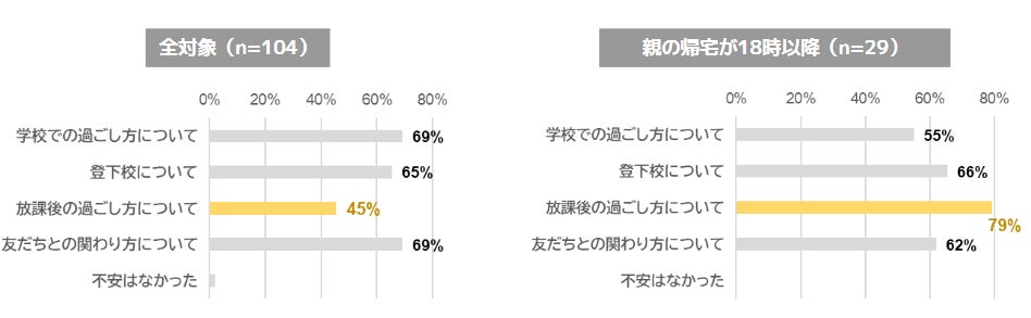 小学生の保護者へのアンケート結果からは、放課後に関する不安は、特に共働きなどで保護者の帰宅が遅い家庭で顕著に高いことが明らかになりました。子どもが「安全に過ごせるか」に対する不安が大きく、下校時の安全性への懸念も同様に強いことがうかがえます。