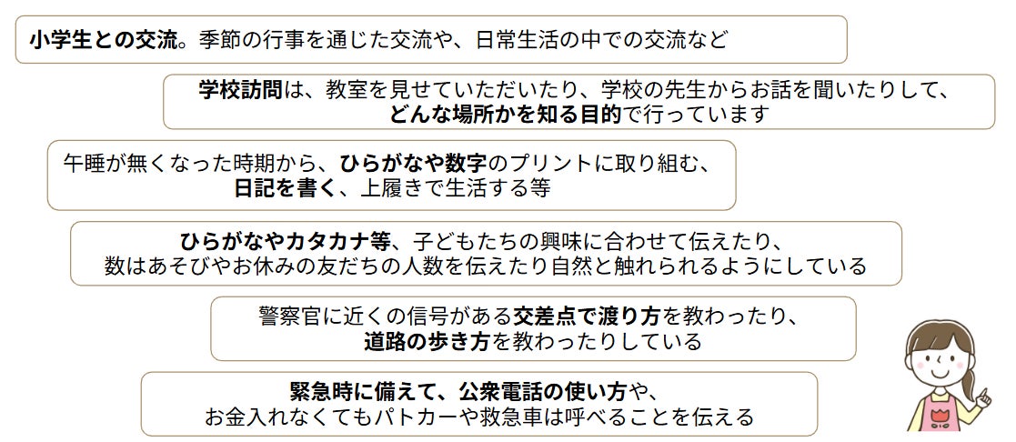 保育所等では小学校入学に向けた準備が行われているものの、「放課後」に関して園児が知る機会は少ない。