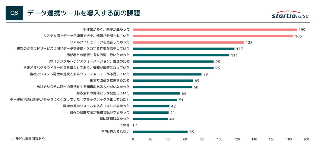 データ連携ツールを導入する前の課題として、最も多かったのは「手作業が多く、効率が悪かった」で189票、次いで「システム間でデータが連携できず情報が分断されていた」が185票という結果となった。また、「リアルタイムでデータを更新したかった」(128票)や、「複数のクラウドサービスに同じデータを登録・入力する作業が発生していた」(117票)などの課題も多く、これらがデータ連携ツール導入の背景にあることが明らかになった。