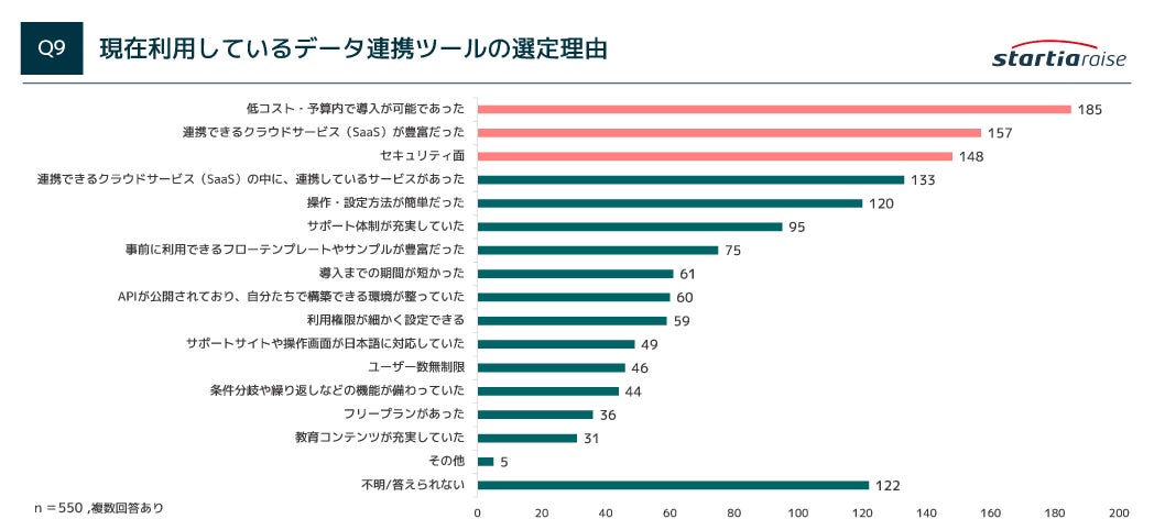 データ連携ツールの選定理由として最も多かったのは「低コスト・予算内で導入が可能であった」が185票で、次いで「連携できるクラウドサービス(SaaS)が豊富だった」が157票。さらに「セキュリティ面」(148票)や「操作・設定方法が簡単だった」(120票)も上位に挙がっており、コスト面や利便性、セキュリティが選定において重要な要素となったことが分かった。
