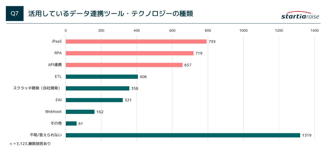 最も多く活用されているツールは「iPaaS(793票)」、次いで「RPA(719票)」「API連携(657票)」が主要なデータ連携手段として利用されていることが分かった。