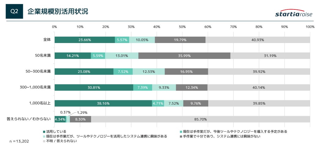 企業規模別にみると、企業規模が大きいほどデータ連携ツール・テクノロジーの導入率が高い傾向が見られる。特に1,000名以上の企業では38.16%が活用中であり、300~1,000名未満の企業も30.81%と比較的高い割合を示している。一方で、50名未満の企業では14.21%にとどまり、「手作業で十分であり、システム連携には興味がない」と回答した割合も35.99%となった。