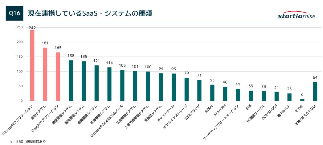 現在連携しているSaaS・システムの中で最も多く利用されているのは「Microsoftアプリケーション」で242票を獲得し、次いで「会計システム」(181票)、「Googleアプリケーション」(165票)となっている。主にMicrosoft製品との連携で活用している担当者が多いことが分かった。