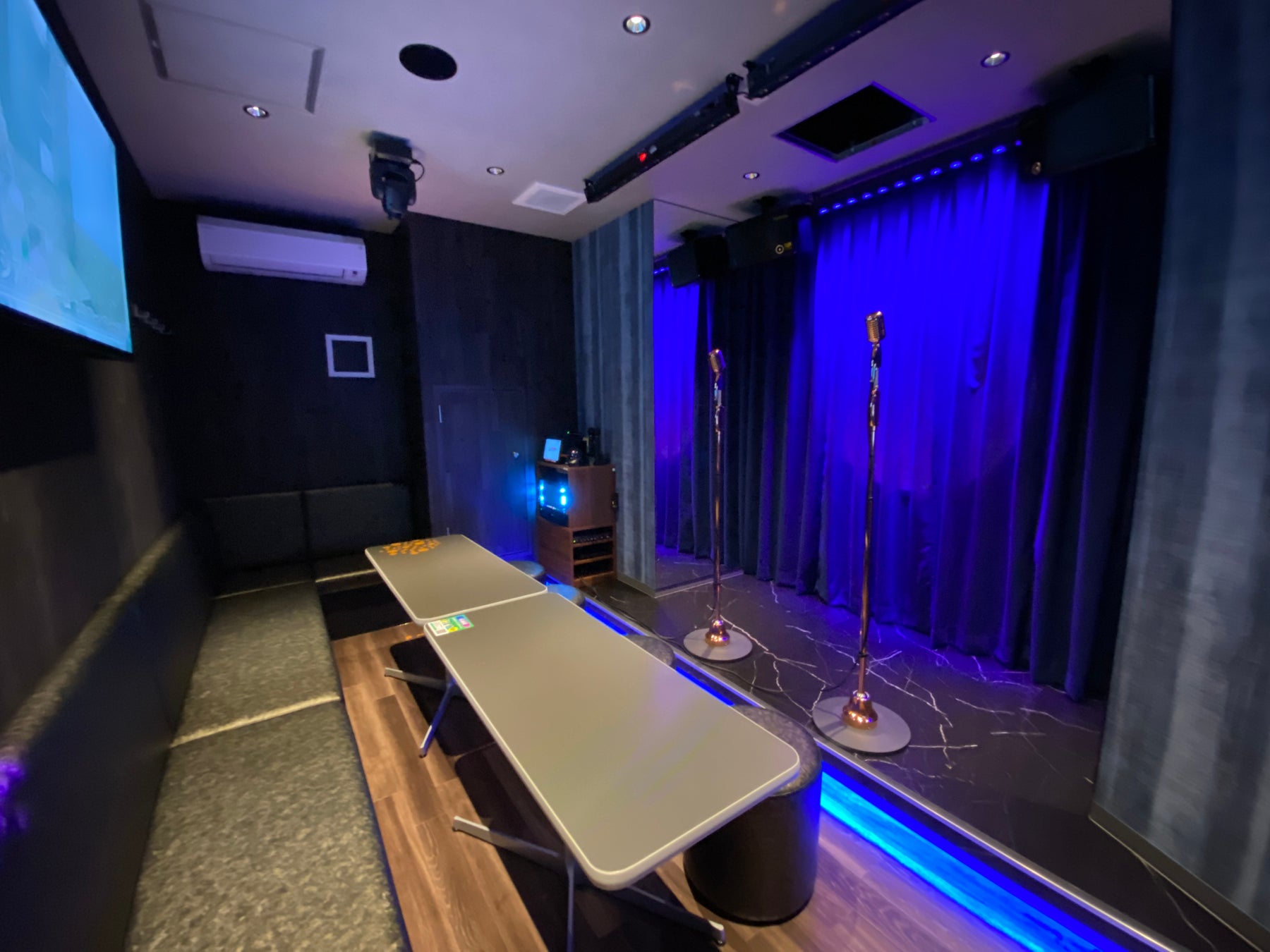 大画面・大音量のプロジェクターで、カラオケはもちろん、スマホのミラーリング機能を使ったライブ映像や映画鑑賞も楽しめる、多目的スペースとなっています。