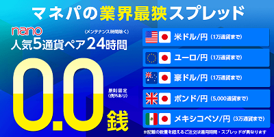 そのほかにも、「パートナーズFX」「パートナーズFXnano」両方の商品で17時00分~27時00分の時間帯をゴールデンマネパタイムとし、全16通貨ペアのスプレッドを業界最狭水準で提示するキャンペーンも実施しております。