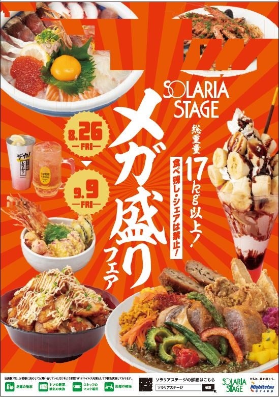 西日本鉄道(株)が運営するソラリアステージでは、2022年8月26日(金)より15日間、「メガ盛りフェア」を開催いたします。期間中は館内飲食・食物販計23店舗にて特大サイズのオリジナルメニューを販売。過去複数回実施し、大人気であった増量企画を今年も実施いたします。今回は、参加店舗の店頭に掲出されるパネルにお料理の【重量】が記載されておりますので、どのメニューにチャレンジするかの参考にしてみてはいかがでしょうか?ぜひ、この期間にメガメニューを食べて暑い夏を乗り切りましょう!