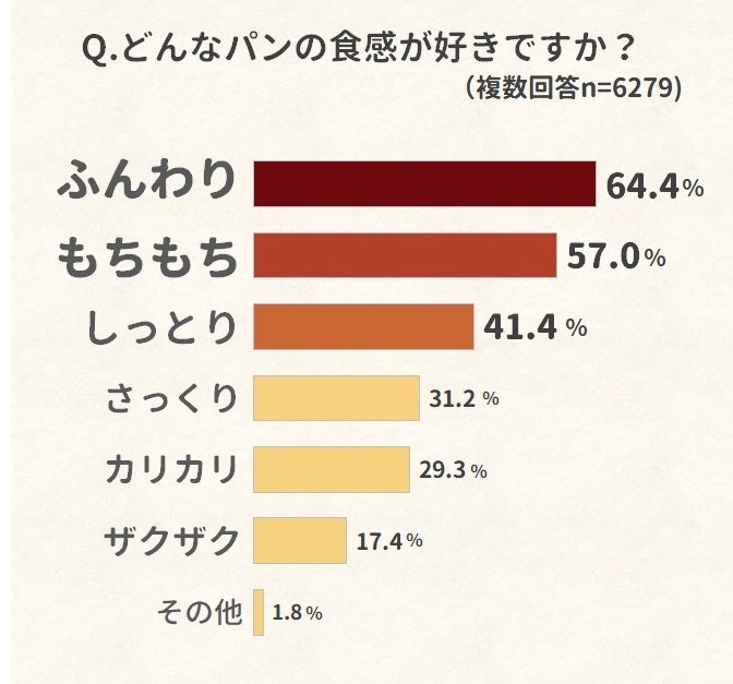 好きなパンの食感についても聞いてみました。トップは「ふんわり」(64.4%)でした。近年流行した「マリトッツォ」もふわふわなパン生地が特徴でした。次いで「もちもち」(57.0%)がランクインしています。米が主食である日本人が好みの食感ともいわれています。3位は「しっとり」(41.4%)という結果でした。上位3位は「柔らかい」食感となりました。