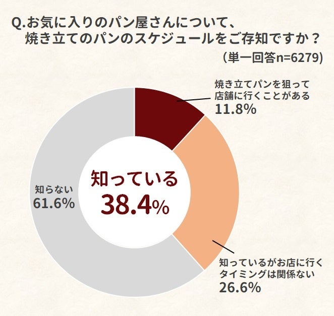 「お気に入りのパン屋さんの焼き立てのパンのスケジュールをご存知ですか?」の質問にも、約4割(38.4%)の人が「知っている(焼き立てパンを狙って店舗に行くことがある+知っているがお店に行くタイミングは関係ない の合計)」と回答しています。自身が食べたいパンがあるかどうかやおいしさを重要視していることがわかります。