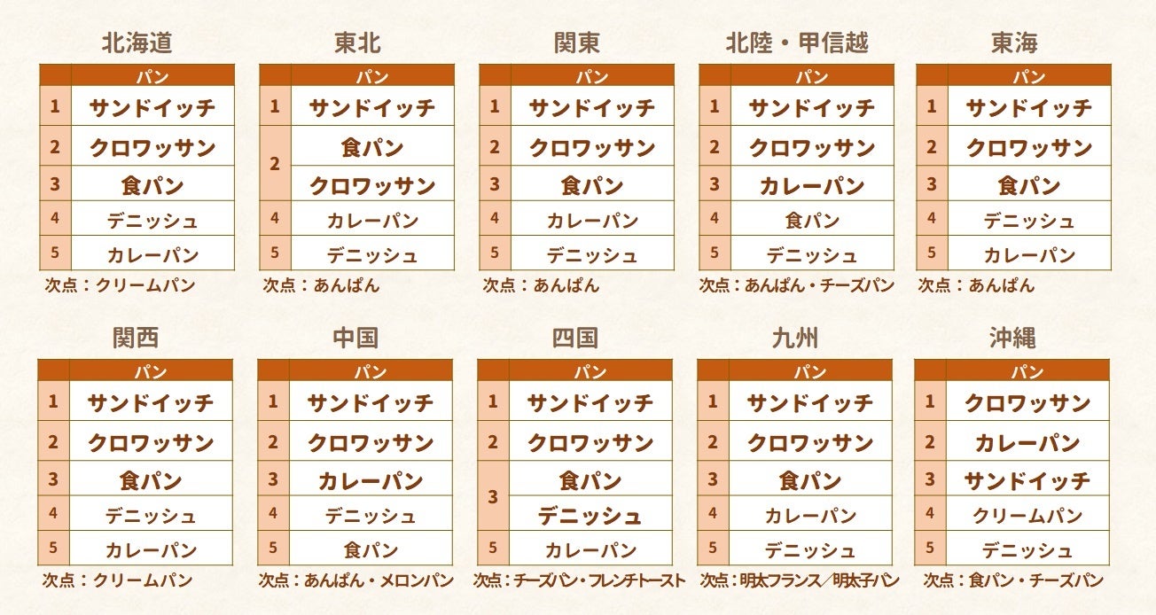 「好きなパン」を回答者の10の地域別に見てみます。北海道~九州までのトップは「サンドイッチ」でしたが、沖縄のみトップは「クロワッサン」でした。沖縄では「朝ごはんを食べない派」が多い(※)ということも関係しているのか、朝ごはんの定番といえる「食パン」は6位にとどまっています。また九州では、6位に福岡名物・明太子を使った「明太フランス/明太子パン」がランクインしています。