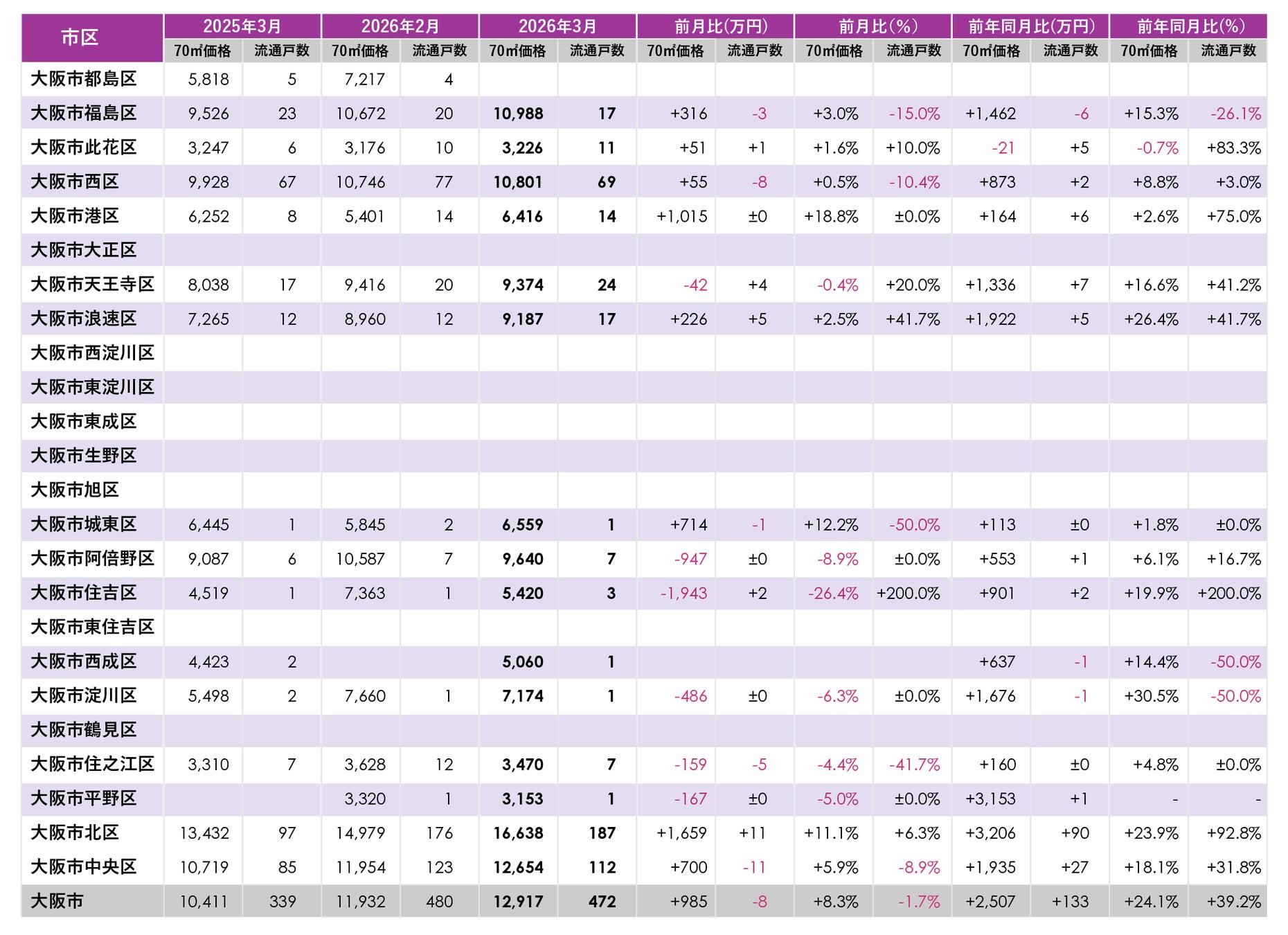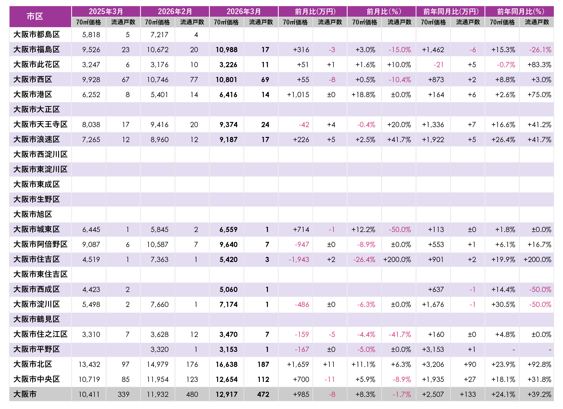 前年同月比は大阪市全体で+2,507万円(+24.1%)と前年の水準を大きく上回り、前月比も+985万円(+8.3%)で、8区で価格が上昇しています。価格が高く、流通戸数も多い北区の価格が大きく上昇し、全体相場を押し上げています。