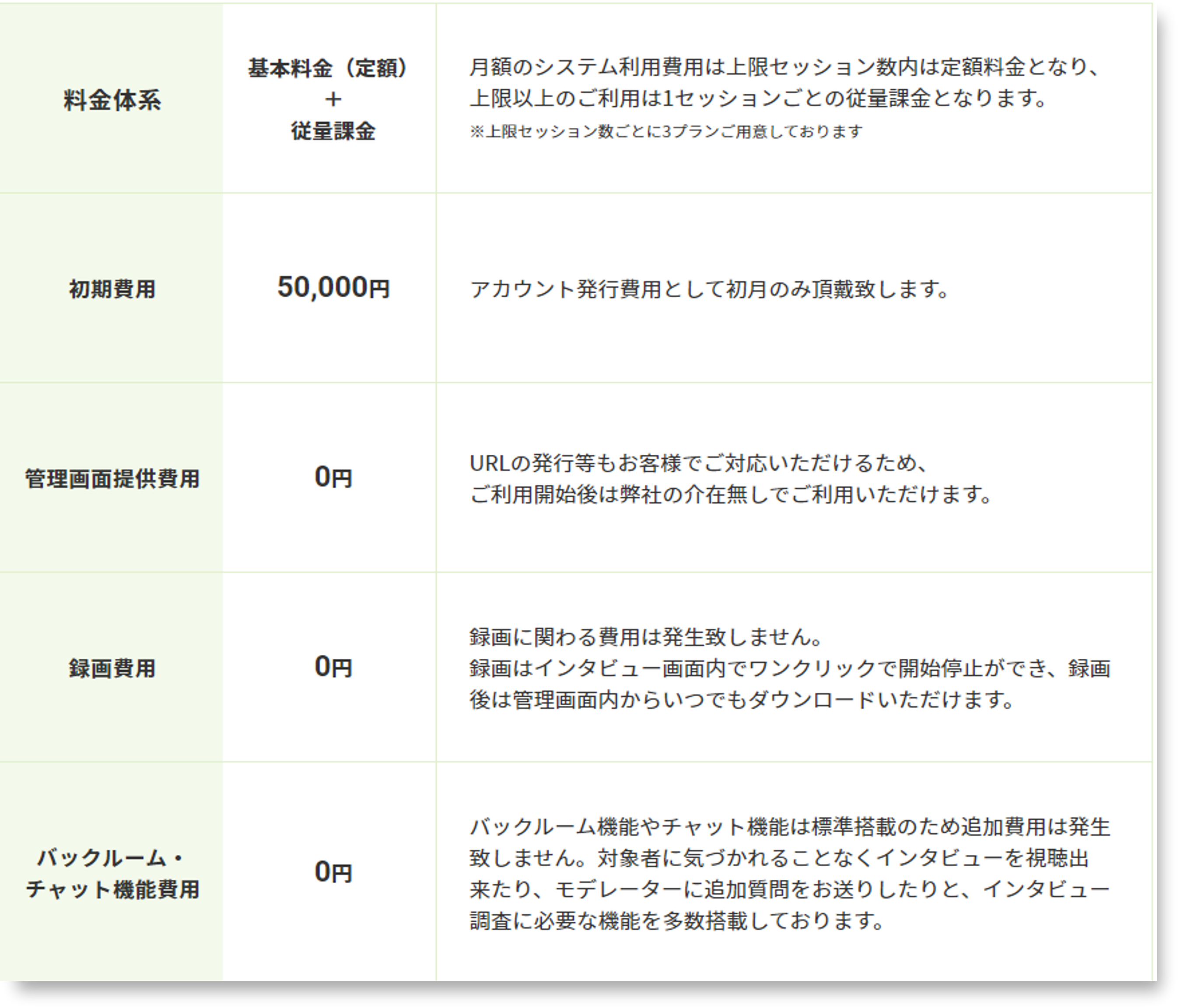 今回リリースを開始した「サブスク利用プラン」では、一定セッション数内でインタビューシステムが使い放題!管理画面ごと月額単価にてお貸出しとなりますので、ご自身のお好きなタイミングで、インタビューURLの発行やインタビュー実施が可能です。