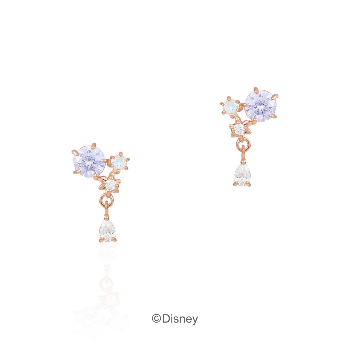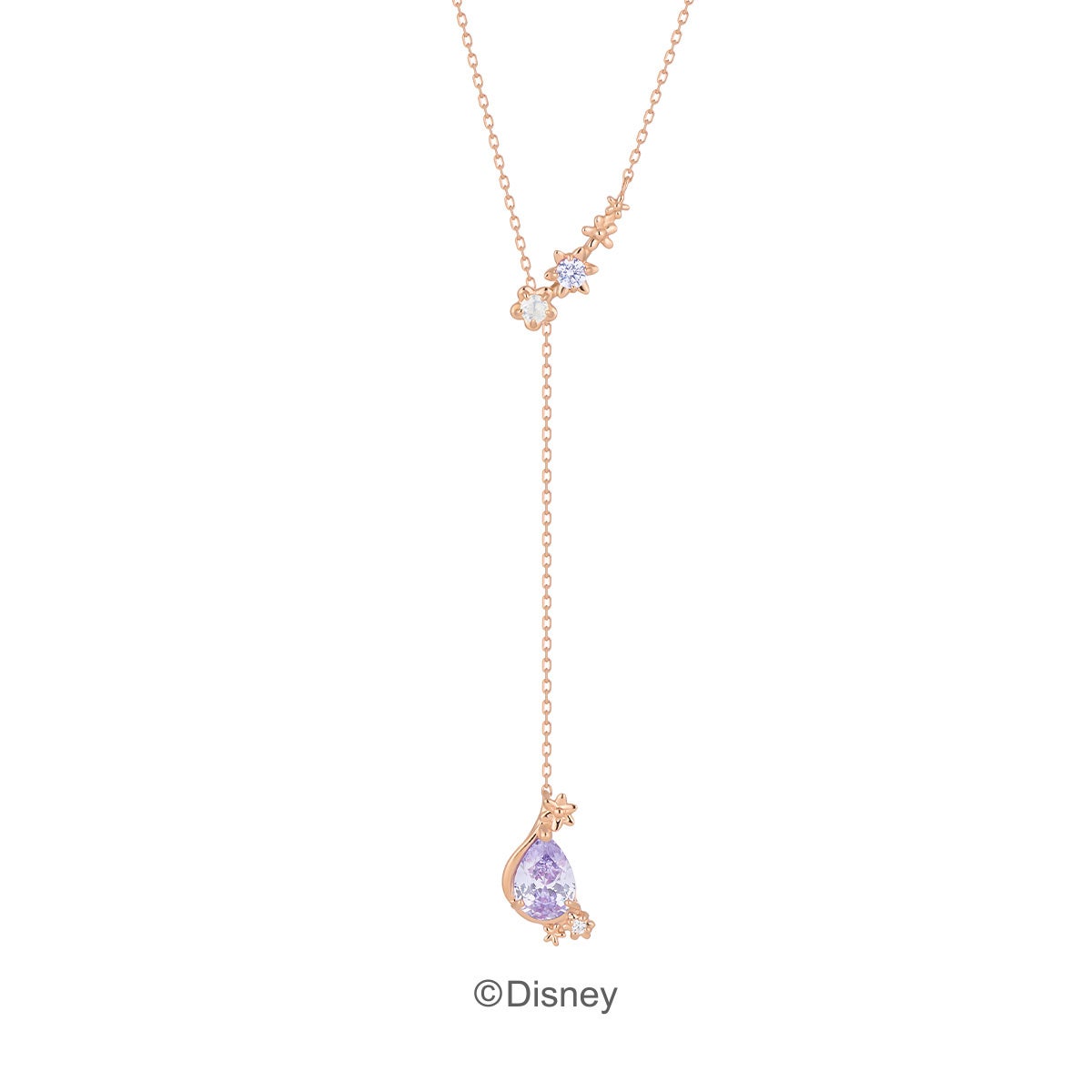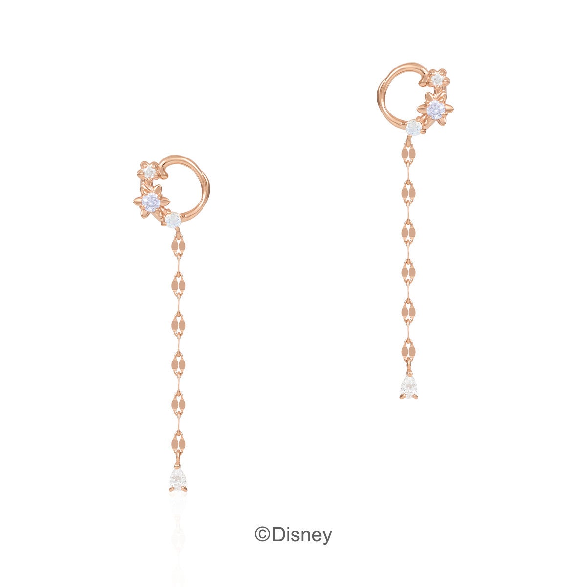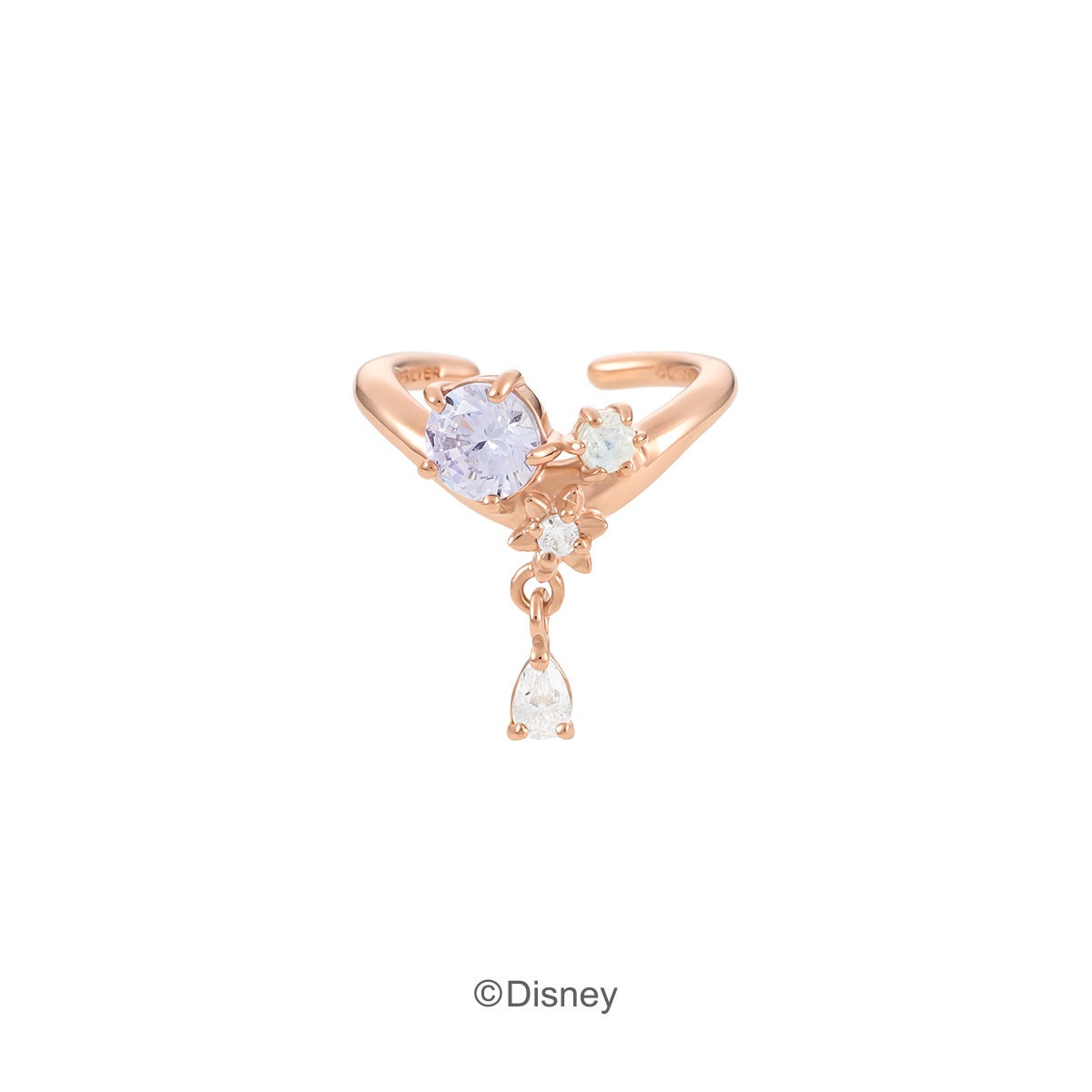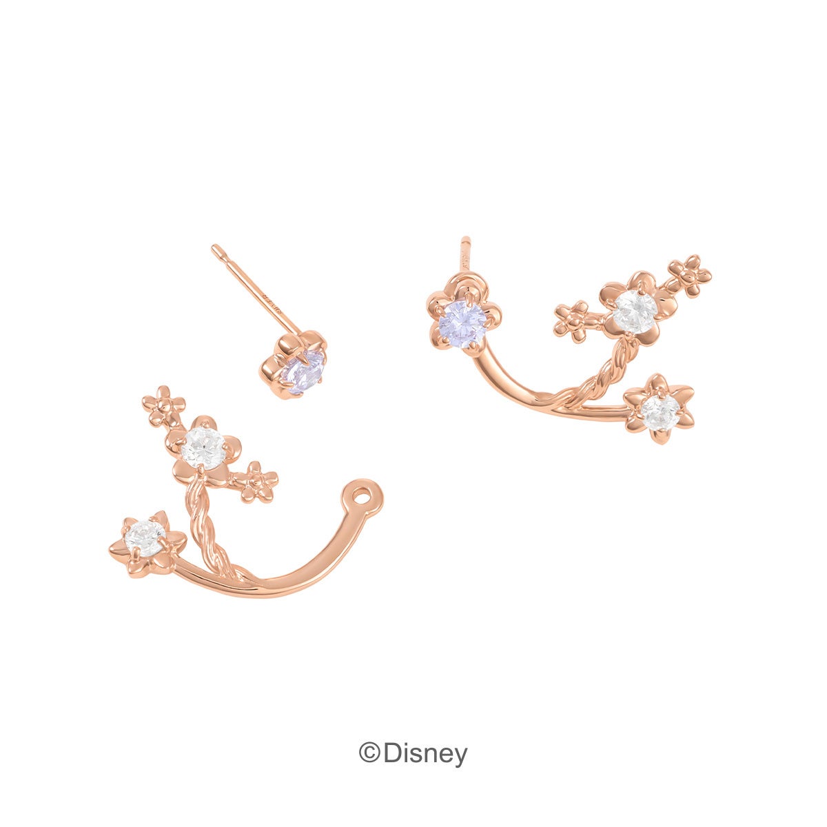 「ラプンツェル」の長い髪と花飾りをイメージしたネックレスやピアスが登場。ラリエットネックレスは、「ラプンツェル」が高い塔の上から降りてくるシーンを揺れるチェーンで表現しました。ラベンダーカラーのキュービックジルコニアを包むのは長い髪をイメージした石座。花飾りをイメージしたフラワーモチーフの中には、不思議な力を与えてくれる「魔法の花」の姿も。細部にまで作品のモチーフを詰め込んだジュエリーを身に纏って、誰からも愛されるラプンツェルのように可憐に輝いて。