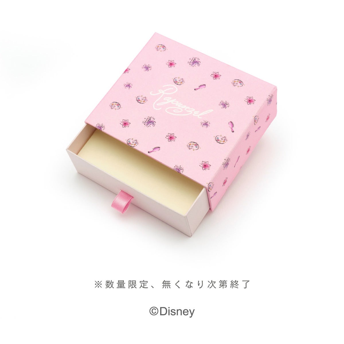 『塔の上のラプンツェル』デザインのジュエリーは、「ラプンツェル」のお気に入りのアイテムを集めた柄の紙箱にお包みしてお渡しいたします。