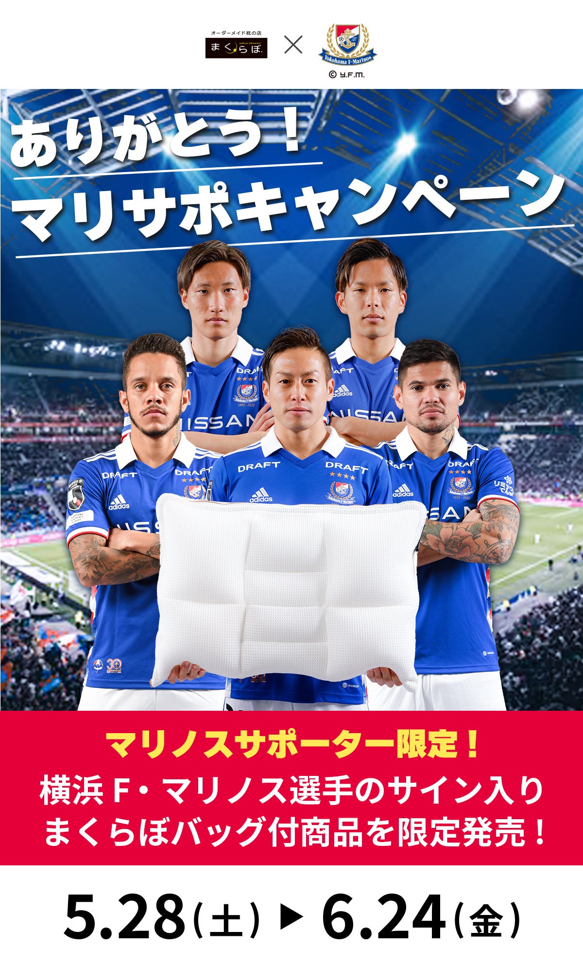 この度まくらぼでは、いつも横浜F・マリノスを共に応援し盛り上げてくださるFマリノスファミリーの皆様へ日頃の感謝の気持ちを込めて、Twitterにて投稿する、特設URLから対象商品をお買い上げの方に、横浜F・マリノス選手直筆サイン入りのまくらぼバッグがついてくる「マリサポキャンペーン」を実施いたします。