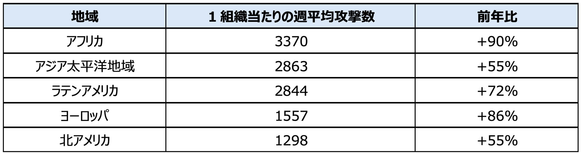 地域別で見ると、アフリカがサイバー脅威の矢面に立たされ、1組織当たり週平均3,370件の攻撃に直面して前年比90%増となりました。ヨーロッパ地域とラテンアメリカ地域でも攻撃の頻度が大幅に増加しており、世界的なサイバー犯罪者の敵意の高まりに無関係の地域などないことを示しています。