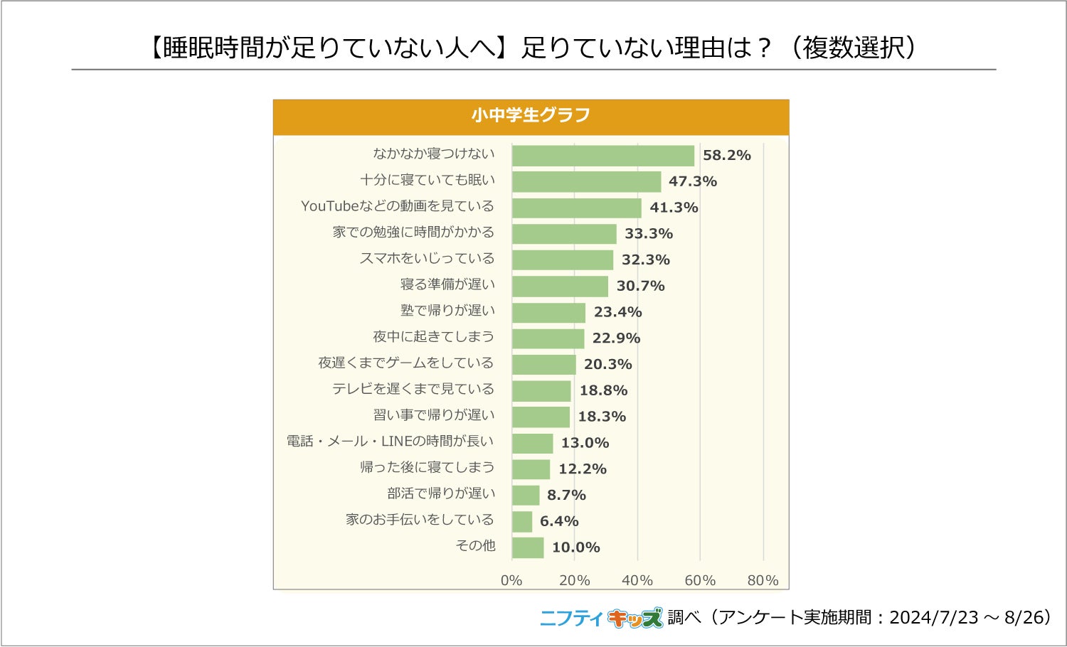 「睡眠時間が足りていない」と回答した人は全体の57.3%で、睡眠不足の原因で最も多かったのは全体の約6割を占めた「なかなか寝つけない」で、「十分に寝ていても眠い」「YouTubeなどの動画を見ている」も上位でした。2割の小中学生が「眠る直前までスマホを使っている」、6%の人が「スマホを触りながら寝落ちする」と回答していることから、スマホの使用がなかなか寝つけない原因のひとつとなっているのかもしれません。