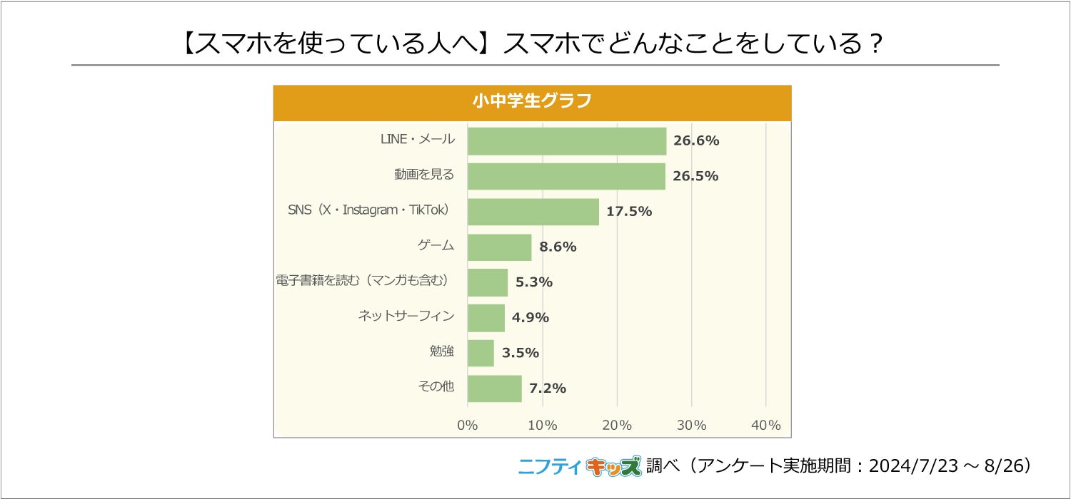 1位が「LINE・メール」、僅差で2位に「動画を見る」がランクインしました。続いて3位に「SNS(X・Instagram・TikTok)」、4位が「ゲーム」でした。