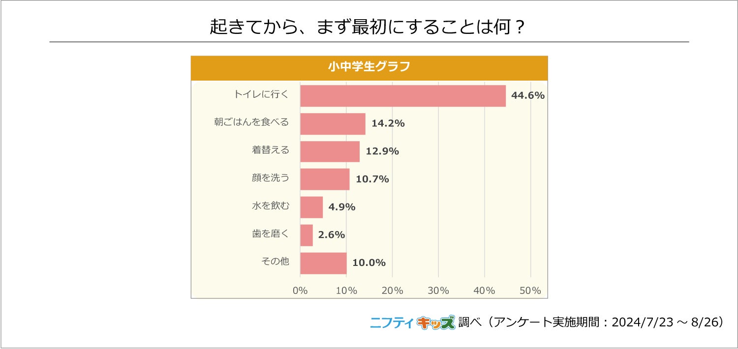 「トイレに行く」と回答した人が圧倒的に多く、1位でした。「朝ごはんを食べる」「着替える」「顔を洗う」は全て1割前後と差がないことから、支度の順序は人それぞれで異なると考えられます。