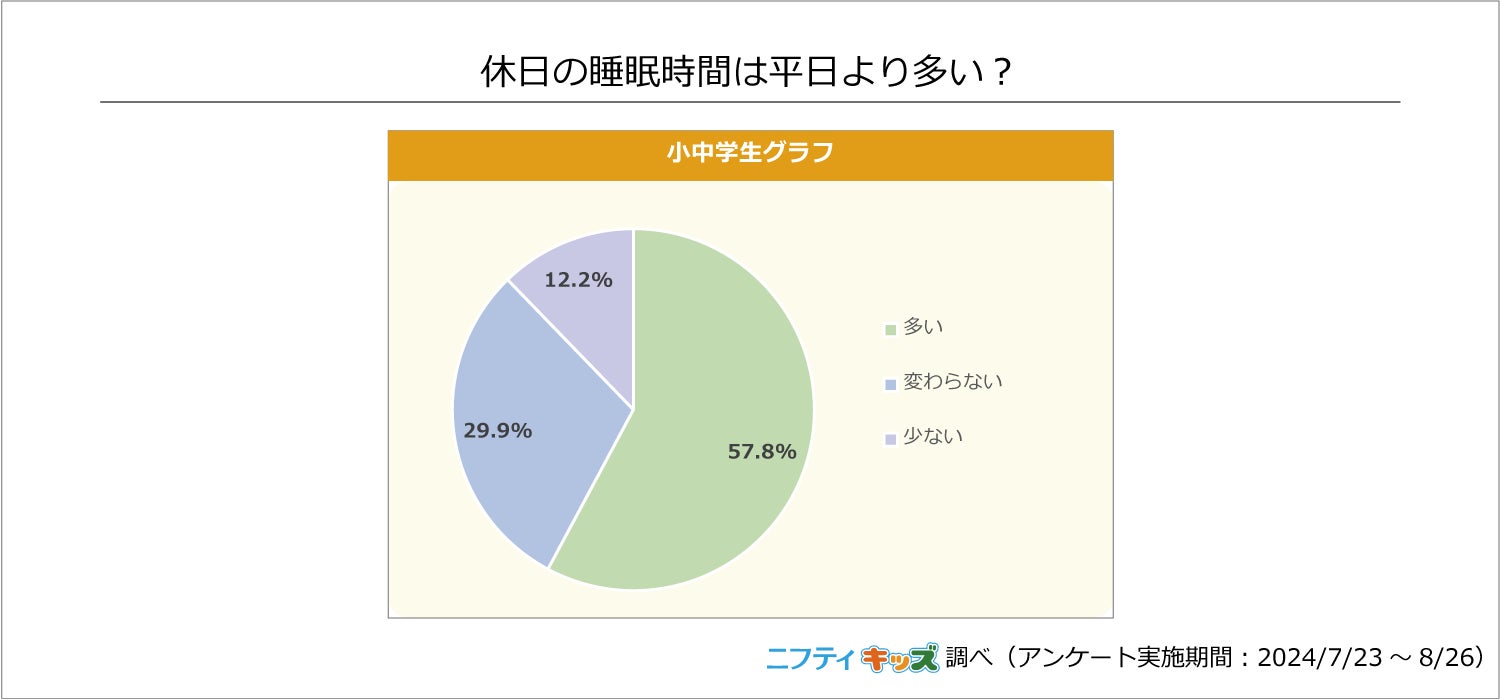 小中学生の約6割が、平日より休日の睡眠時間が「多い」と回答しました。学校がない休日は、決まった時間に起きる必要がないためゆっくり起きる子どもたちが多いようです。
