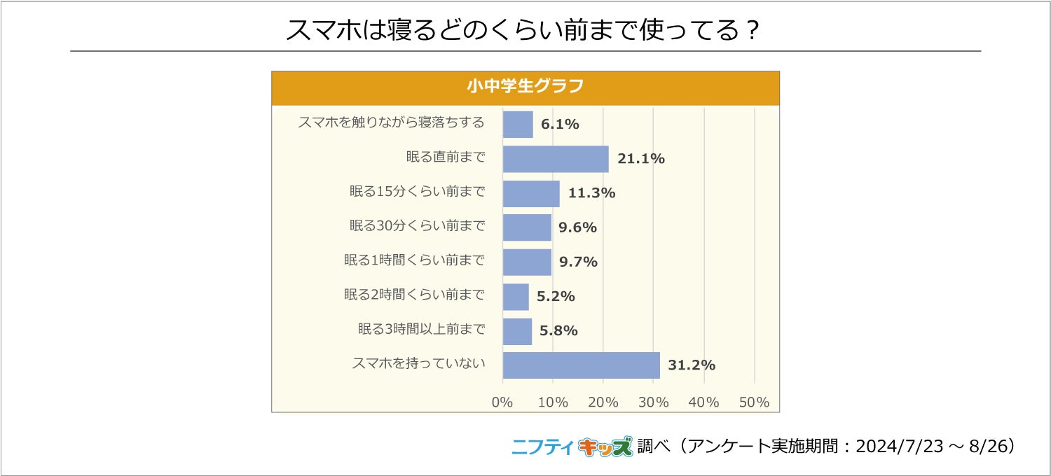 【調査結果】小中学生の21.1%が「眠る直前までスマホを使用」、中にはスマホを触りながら寝落ちする人も。睡眠不足を感じる小中学生は57.3%