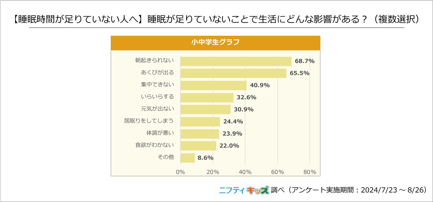小中学生の65%以上が「朝起きられない」「あくびが出る」と回答しました。次に「集中できない」「いらいらする」「元気が出ない」といった回答が続き、学校生活への影響は少なくないようです。
