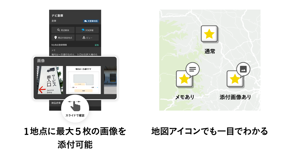 これまでも「My地点」の詳細情報としてメモ(テキスト)を記載できましたが、本対応により、画像を5枚まで添付し、視覚的な情報を保存・管理できるようになります。添付した画像は、地点の詳細情報に表示されます。また、画像を登録している地点は、地図上のアイコンに画像マークが表示されるようになるため、どの地点に画像が添付されているかも、一目でわかります。