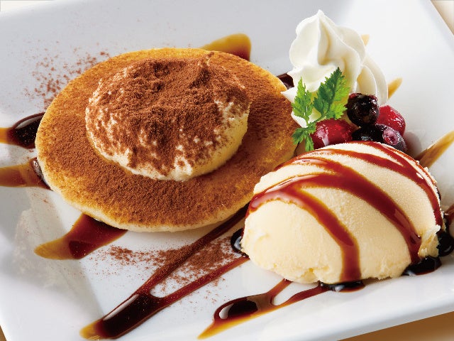 北海道産マスカルポーネチーズがコク深く、口溶けなめらかに仕上げたティラミスパンケーキです。
