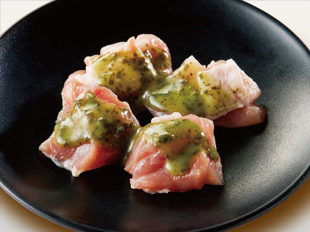 ぷりっと弾力のあるせせりの食感を爽やかな風味のバジルソースと共にお楽しみください。