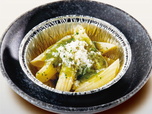 ホイルで炒めて熱々ペンネをバジルの爽やかな風味と共にお楽しみください。