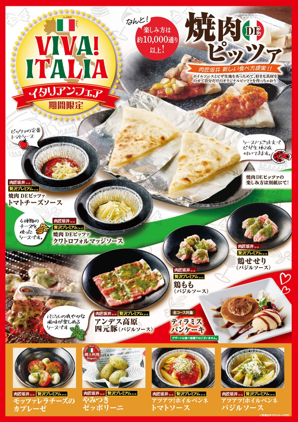 国産牛焼肉食べ放題「肉匠坂井」では、6月11日(水)より期間限定で「イタリアンフェア」を開催します。今回の注目は「焼肉DEピッツァ」。お好きなメニューを温めたピッツァにのせて各種ソースと共にお楽しみください。食べ放題メニューが自慢の「肉匠坂井」が今夏にプロデュースする新しい食べ方の提案でございます。その他にもバジルの爽やかな香りやトマトソースなど暑さを癒すメニューもございます。是非、この機会にお楽しみください。皆様のご来店をスタッフ一同お待ちしております。