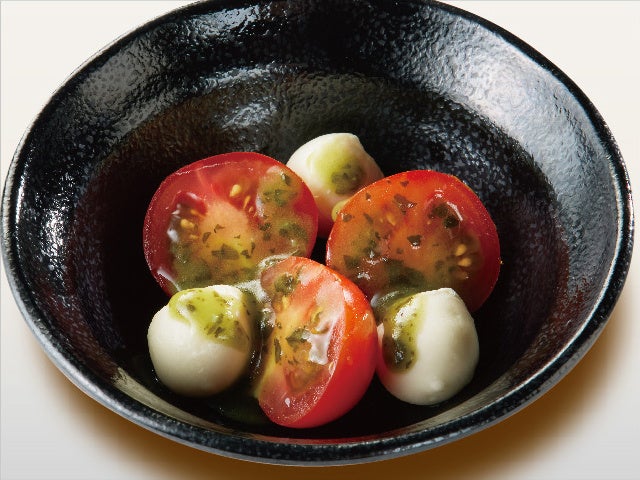 一口サイズのモッツァレラチーズのカプレーゼです。赤・白・緑はイタリアの国旗の同じ色合いです。焼肉のお供としてもお口にあいます。