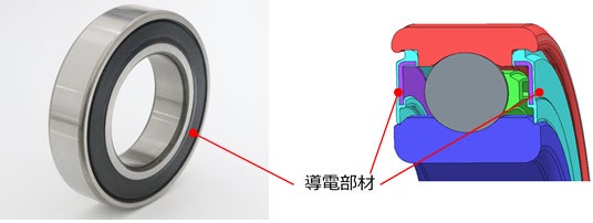 eAxleのモーター用軸受に導電機能を持たせた導電軸受です。モーター用軸受には、軸受内部に電気が流れることで損傷する電食が発生することがありますが、新開発の導電部材を軸受に採用することで、電食抑制を可能としました。