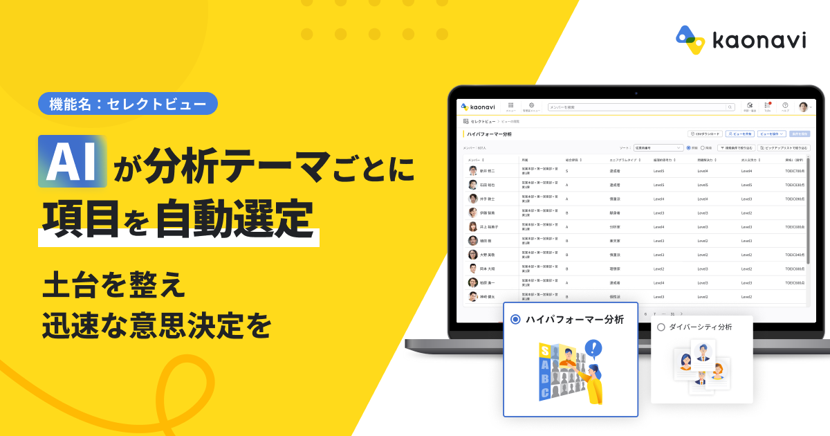 株式会社カオナビ(本社:東京都渋谷区、代表取締役社長CEO:佐藤 寛之)が提供するタレントマネジメントシステム「カオナビ」は、人材データベースの情報を目的に合わせて抽出・一覧表示できる「セレクトビュー」において、ハイパフォーマー分析などのテーマに応じて、AIが分析に最適なデータ項目を選定する機能を、2026年3月19日(木)より提供します。