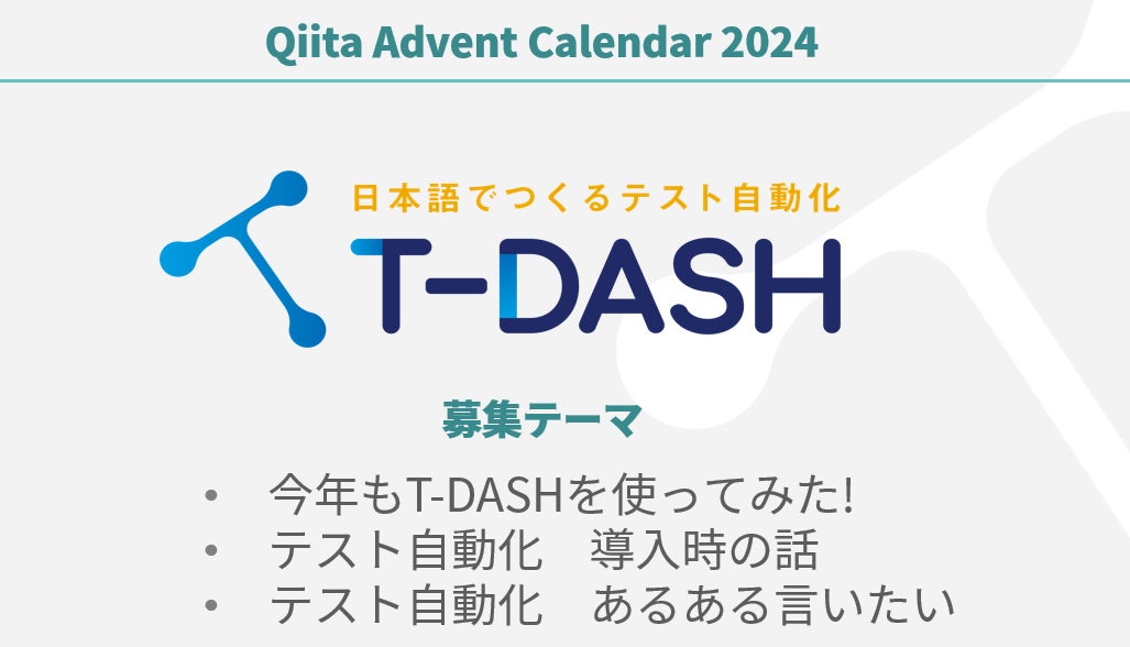 Qiita Advent Calendar 2024の期間開催中に、テスト自動化ツール「T-DASH」を使ってみた話や自動化あるあるなど、テスト自動化にまつわる記事を2024年12月25日まで募集します。