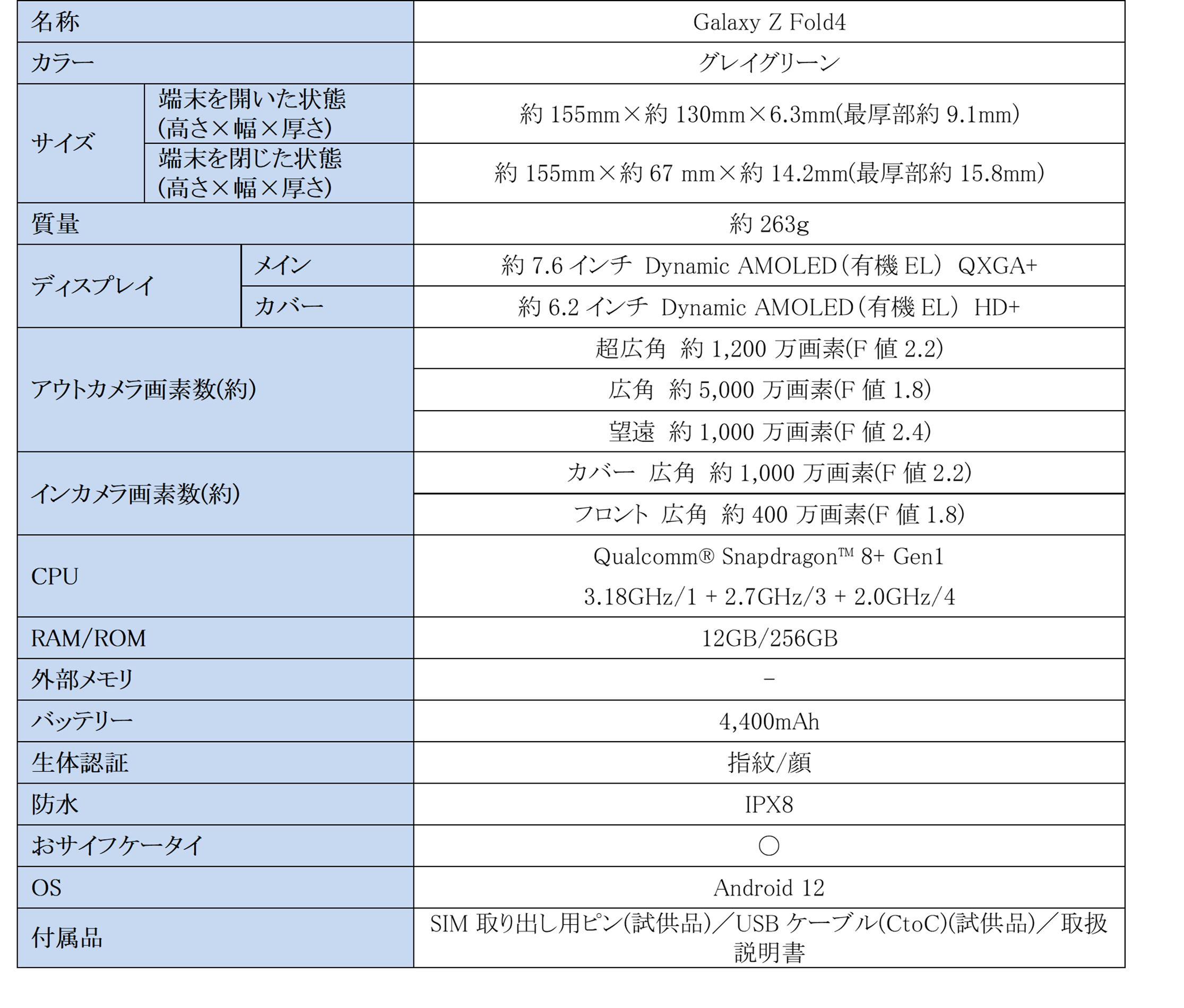 「Galaxy Z Fold4」の特長は、以下のとおりです。