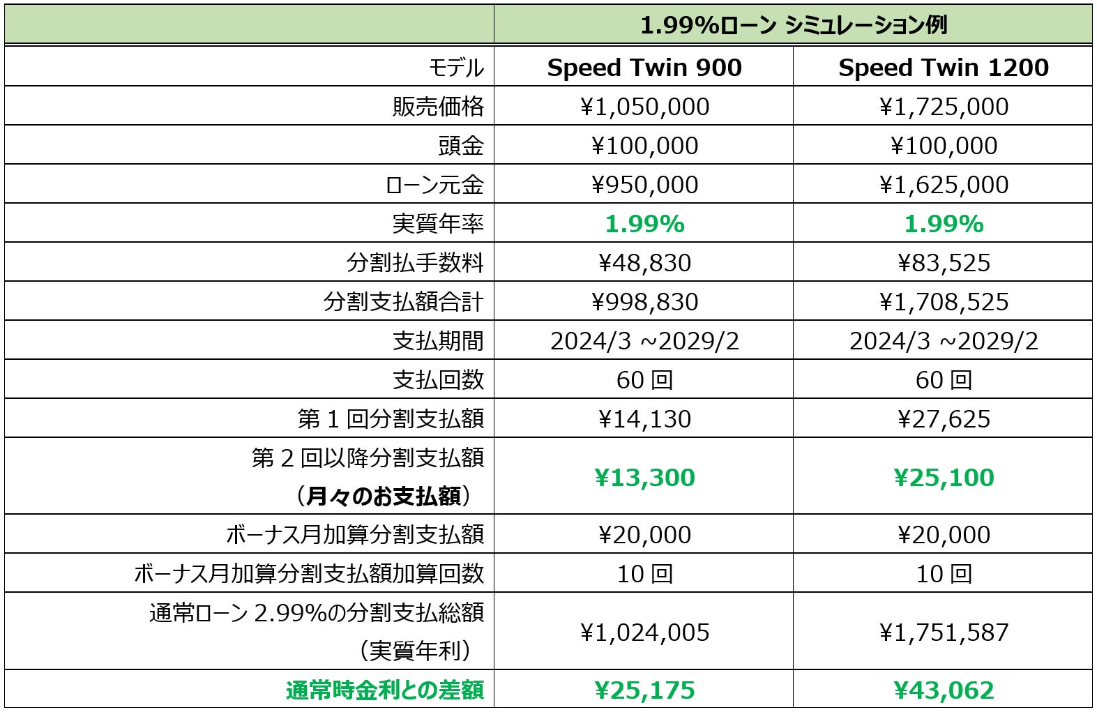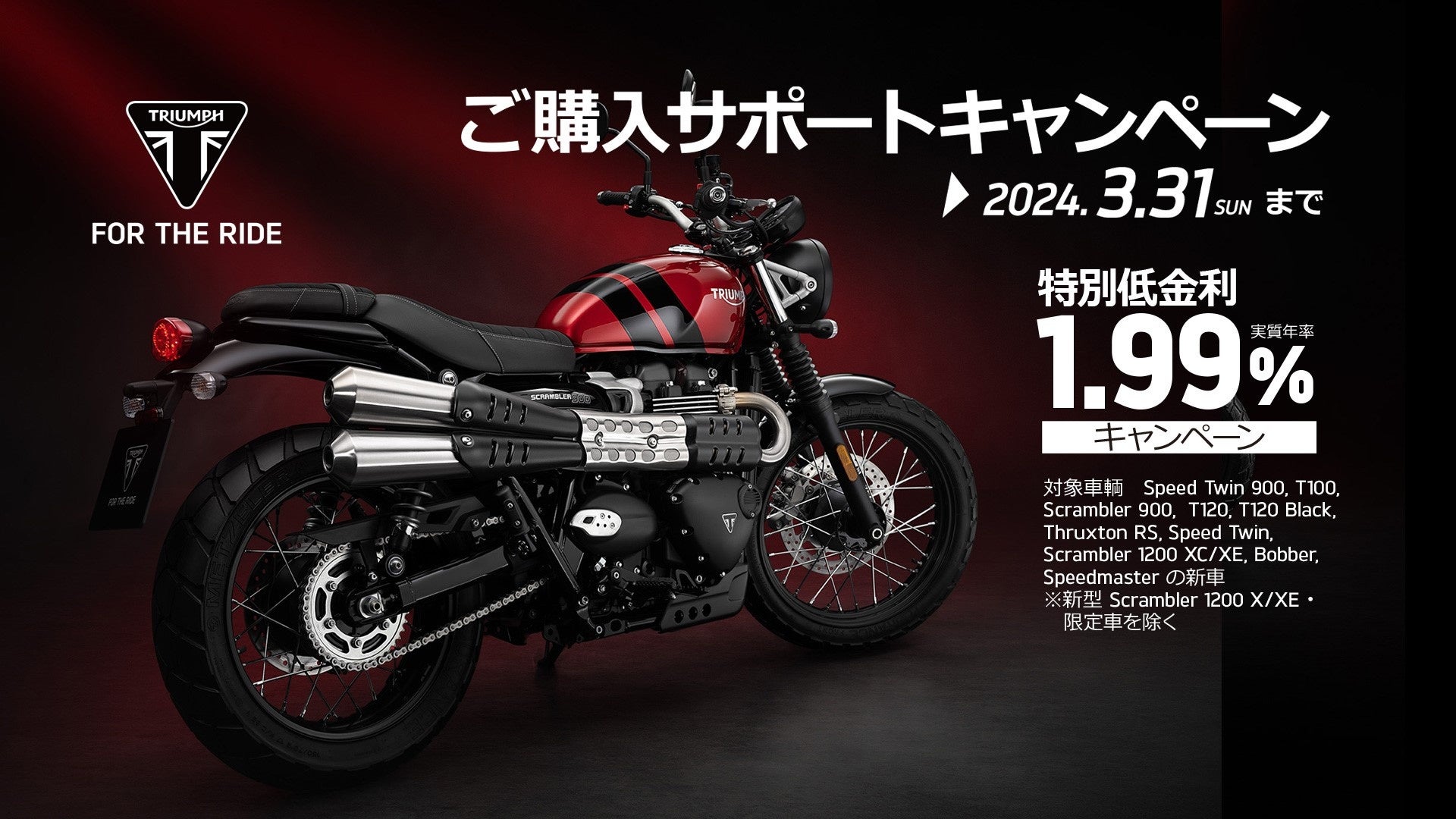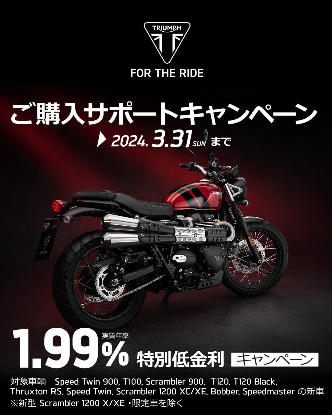 内容:キャンペーン期間中、全国のトライアンフ正規販売店にて対象車両をご成約、且つローン契約完了していただいたお客様に、「1.99% 特別低金利ローン」をご提供いたします。