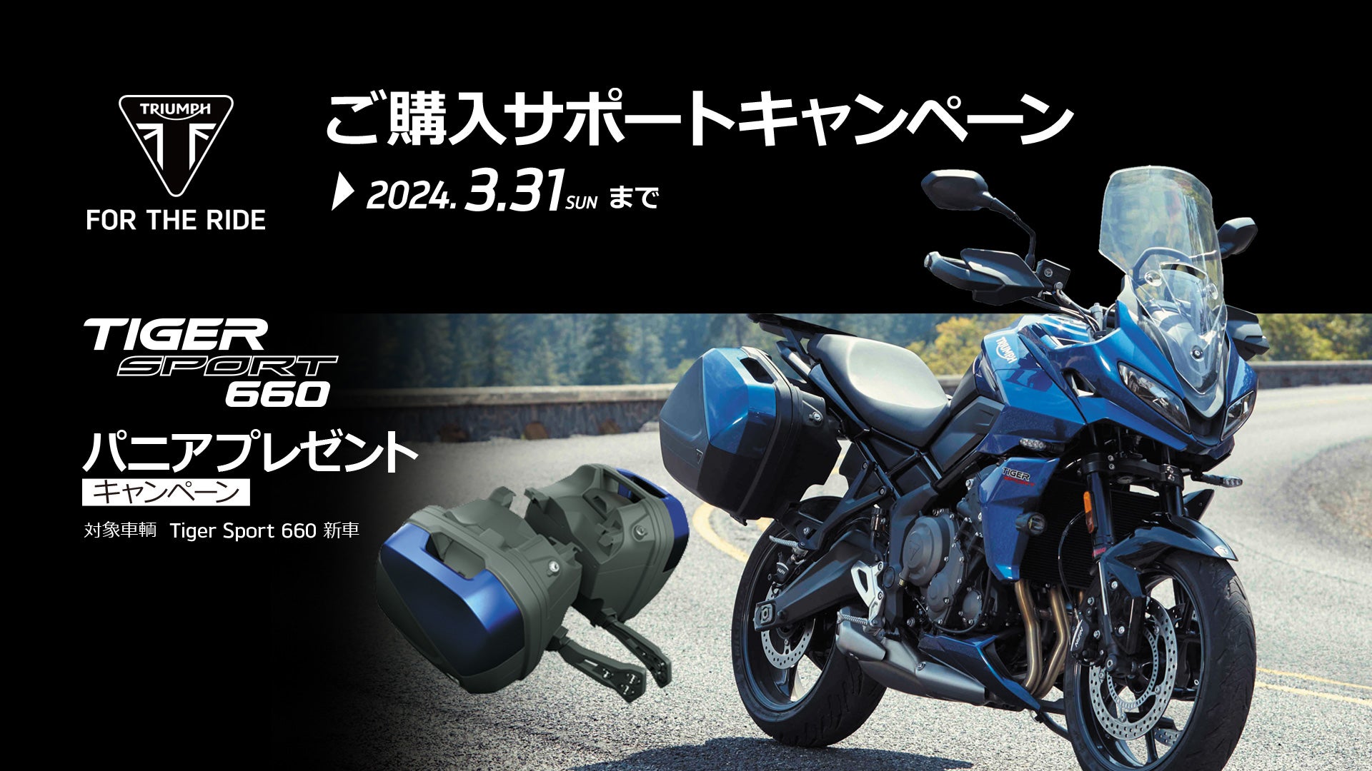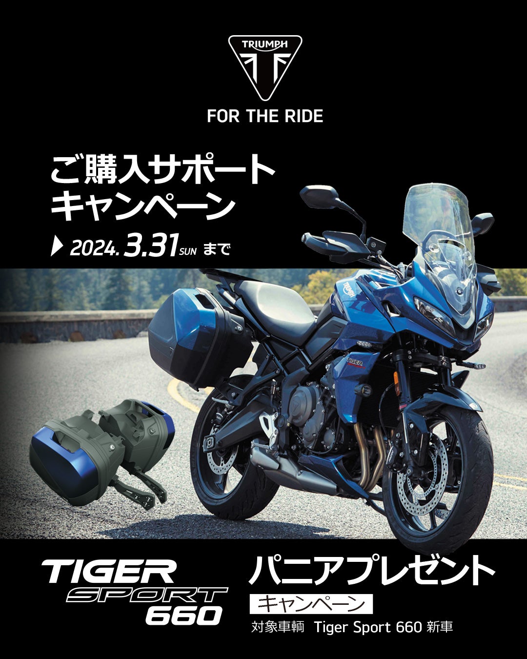 全国のトライアンフ正規販売店にてTIGER SPORT 660の新車をご成約いただいた方へ、サイドパニアケースをプレゼント