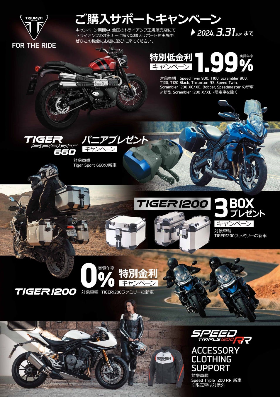 今回の追加内容は、モダンクラシックシリーズを対象とした「1.99% 特別低金利」、Tiger 1200を対象とした「0% 特別金利」、更に「TIGER SPORT 660 パニアプレゼント」「TIGER 1200 3BOXプレゼント」「Speed Triple アクセサリー/クロージングプレゼント」の5つが追加された、充実のサポートです。