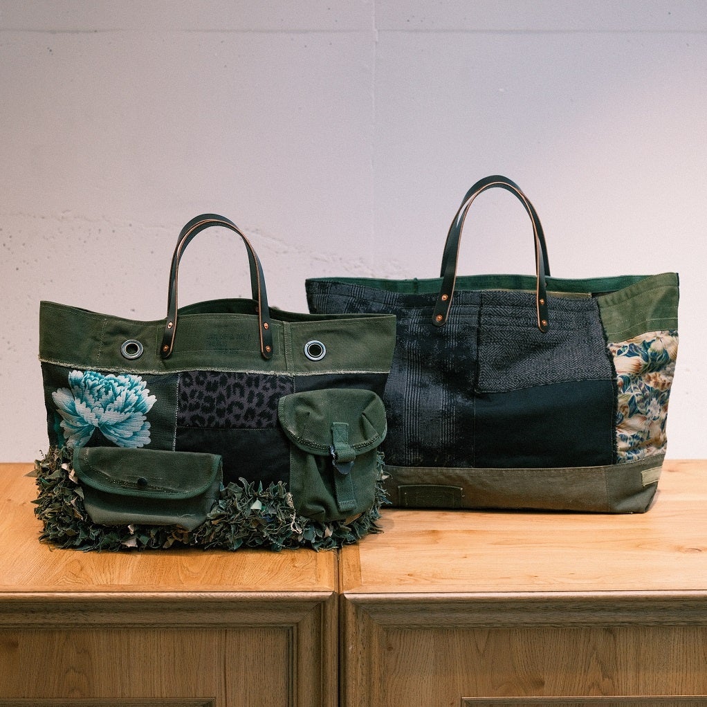 (4)“Local Made Military Items”をコンセプトに、1940〜80年代の米軍アイテムをデザイナーKen Naoiの手で解体・再構築してバッグや小物を制作する<Room No.6>とのコラボレートアイテムとして、互いの特徴的な素材を組み合わせ、ハンドメイドで作られた一点物のバッグ