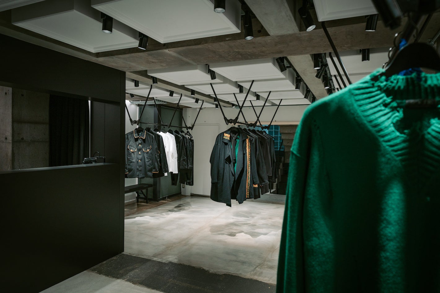 「かつてYohji Yamamotoの店舗として建設されたビルが、ご縁があり再び店舗として使用できるということで始まった大阪のプロジェクト。鉄筋コンクリート製の5階からなるこのビルの特徴は浮遊感。フロア、階段、とあらゆる箇所に隙間がある設計は現在においてあまり目にすることのない作りでした。その特徴を活かしつつ、現代の安全基準に落とし込みながら、自由に売り場を変化させる。フロア毎を季節で入れ替えたり、ポップアップを開催したりと、オンラインプラットフォーム上で展開していたWILDSIDE YOHJI YAMAMOTOを、どう実店舗として形にするかと考えたのが、青山のYohji Yamamoto 2でも採用した吊り式のハンガーをグリッドに見せるということでした。また躯体に関わる造作も同じく鉄板を使うことで、両店舗に同じコンセプトを感じさせるように設えています。心斎橋の裏道にできたこの店舗が、Yohji Yamamotoの世界感を多面的に感じることのできる、今後のブランドの指針となる店舗になればと思っています。」