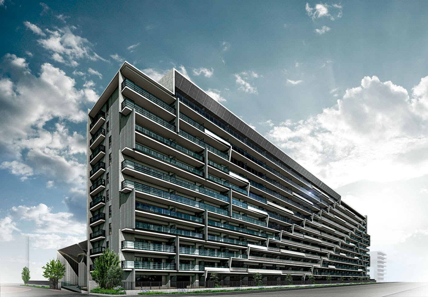 高さ約35m、総戸数236邸の大規模レジデンスとして誕生する「レーベン小鶴新田 THE ONE」。重厚な壁を思わせる存在感と、バルコニー面を縦・横・斜めとリズミカルに区切るアシンメトリーなデザインが、駅前の風景、そして街の風景をドラマチックに変えていきます。