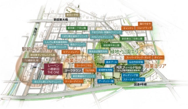JR仙石線「小鶴新田」駅まで徒歩1分、駅のロータリーと直結する場所に誕生するレジデンス。現地から徒歩5分には、食品スーパー、ホームセンター、ドラッグストア、グルメ店などが入る便利な商業施設「ヨークタウン新田東」がございます。また、野球場、体育館、プールなどが揃う総合運動場「元気フィールド仙台」も徒歩圏。このエリアだけでショッピングやレジャーなどの様々なモノ・コトが完結できます。