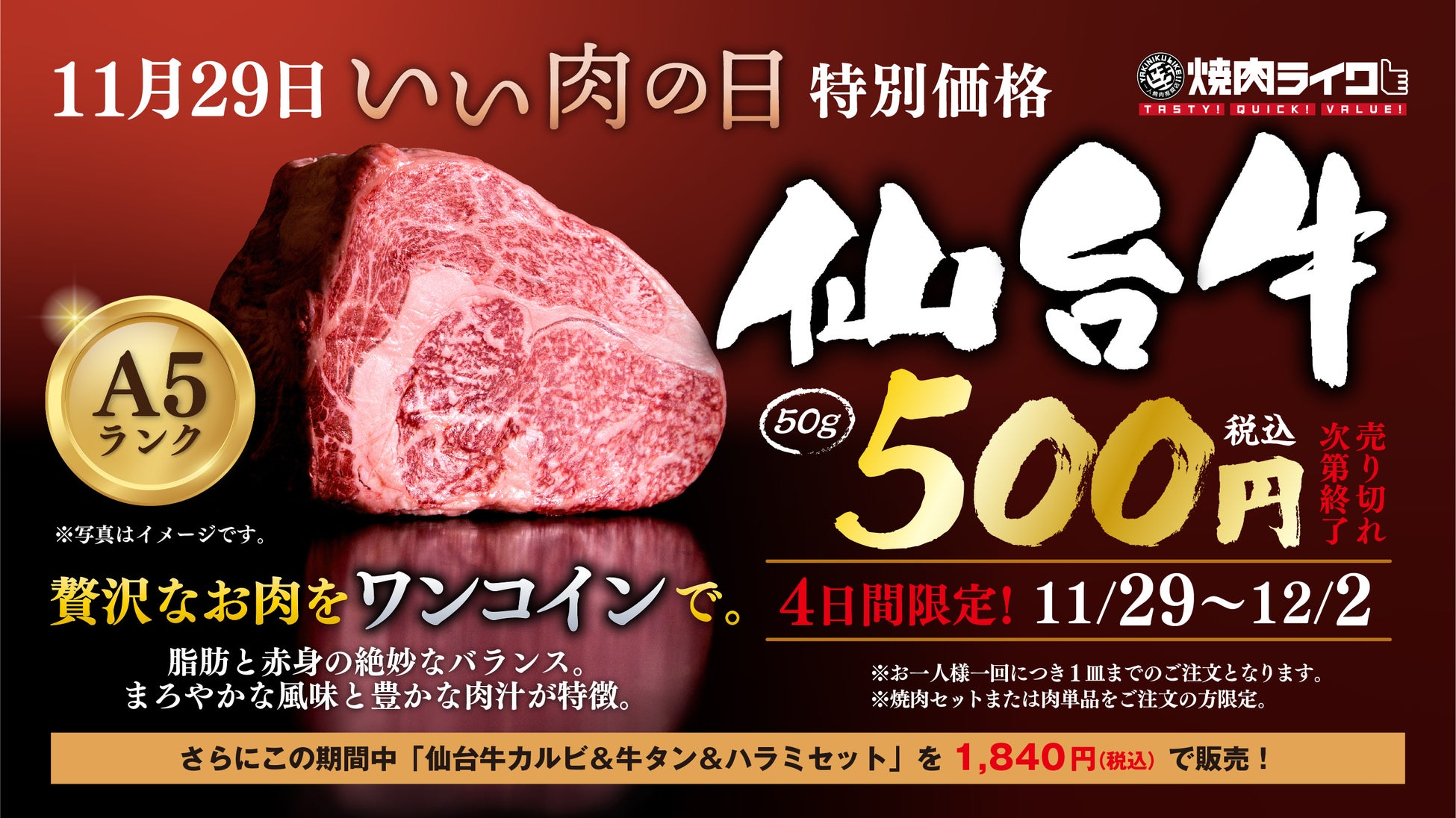 11月29日(いい肉の日)は贅沢なお肉を気軽に。焼肉ライク初登場の高級和牛「仙台牛」が破格の500円にて登場!4日間限定で全国86店舗にて販売