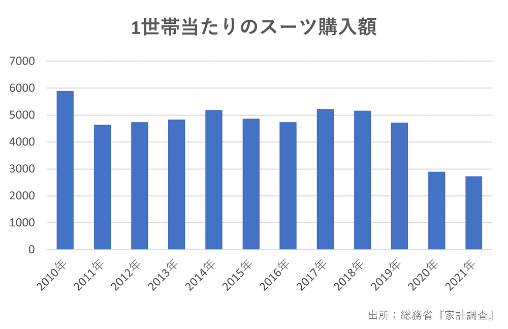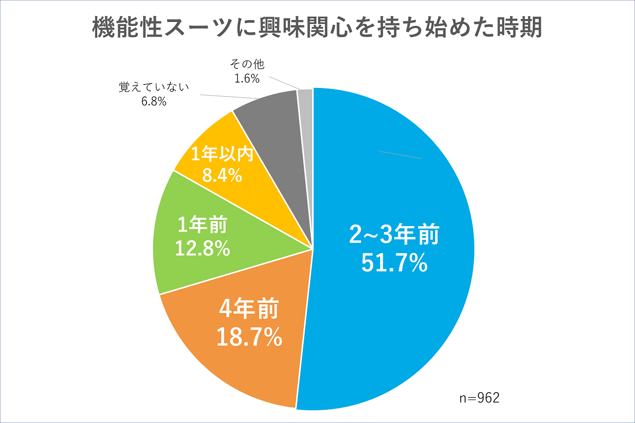 総務省の家計調査によると、1世帯当たりのスーツ(背広)に対する支出額は年々低下し、コロナの影響で紳士服業界は多大なる打撃を受けています(下図)。一方で、WWS男女メルマガ会員を対象にしたアンケートによると、機能性スーツについて興味関心を持ち始めた時期という質問に対し、半数以上が「2~3年前」と回答したことからコロナ以降、機能性スーツへの興味関心は高まっていることが分かります(資料1参照)。