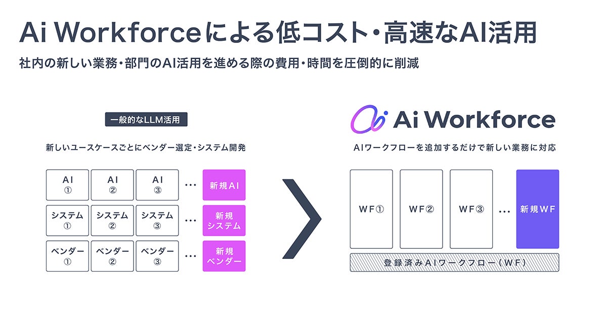 Ai Workforce上でAIワークフローを追加していくことで、ユースケースごとに別のシステムを開発する必要がなく、低コスト・高速にAI活用を進められます。